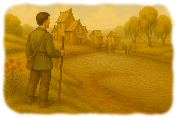 But the fields stretched on, and the sun kept climbing.  His heel rubbed inside his boot and began to burn.  The soles of his feet ached.  His legs grew heavy.  He briefly contemplated turning back—but he’d come so far already.  It was probably further back than forward.  Besides, he had no place to go back to.  Well, there was…  No, he thought, never back to his parents.   Better to drown in the Slough than that.