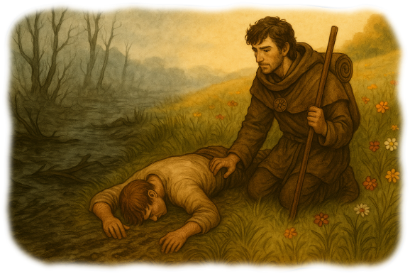 A young man lay motionless, face-down in the mire at the edge of the Slough, his clothes caked with mud.  Companion rushed to his side, knelt, and gently turned him over, listening for breath.  He was still alive.