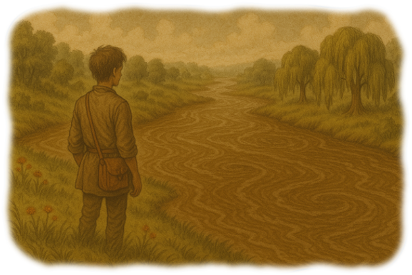 시커는 결심했다—강을 따라가기로. 하지만 어느 쪽으로 갈 것인가? 머리 위의 태양은 아무런 안내도 주지 않았다. 오른쪽은 그가 왔던 길로 다시 돌아가는 듯해 보여서, 그는 왼쪽으로 향했다. 하지만 굽이치고 돌아가는 흐름 때문에 분간하기가 어려웠다.