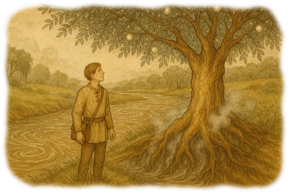그가 다가가자 대지는 숨을 죽인 듯 고요해졌다. 나무의 줄기는 뒤틀리고 넓었으며, 껍질에는 마치 빛이 표면 아래에 머무는 듯한 은은한 광채가 있었다. 강가에 단단히 뿌리를 내리고 있었지만, 거대한 뿌리들은 물속 깊이 잠겨 있었다. 안개가 그것들에 달라붙어 부드럽게, 끊임없이 형태를 바꾸는 장막처럼 감돌고 있었다.
